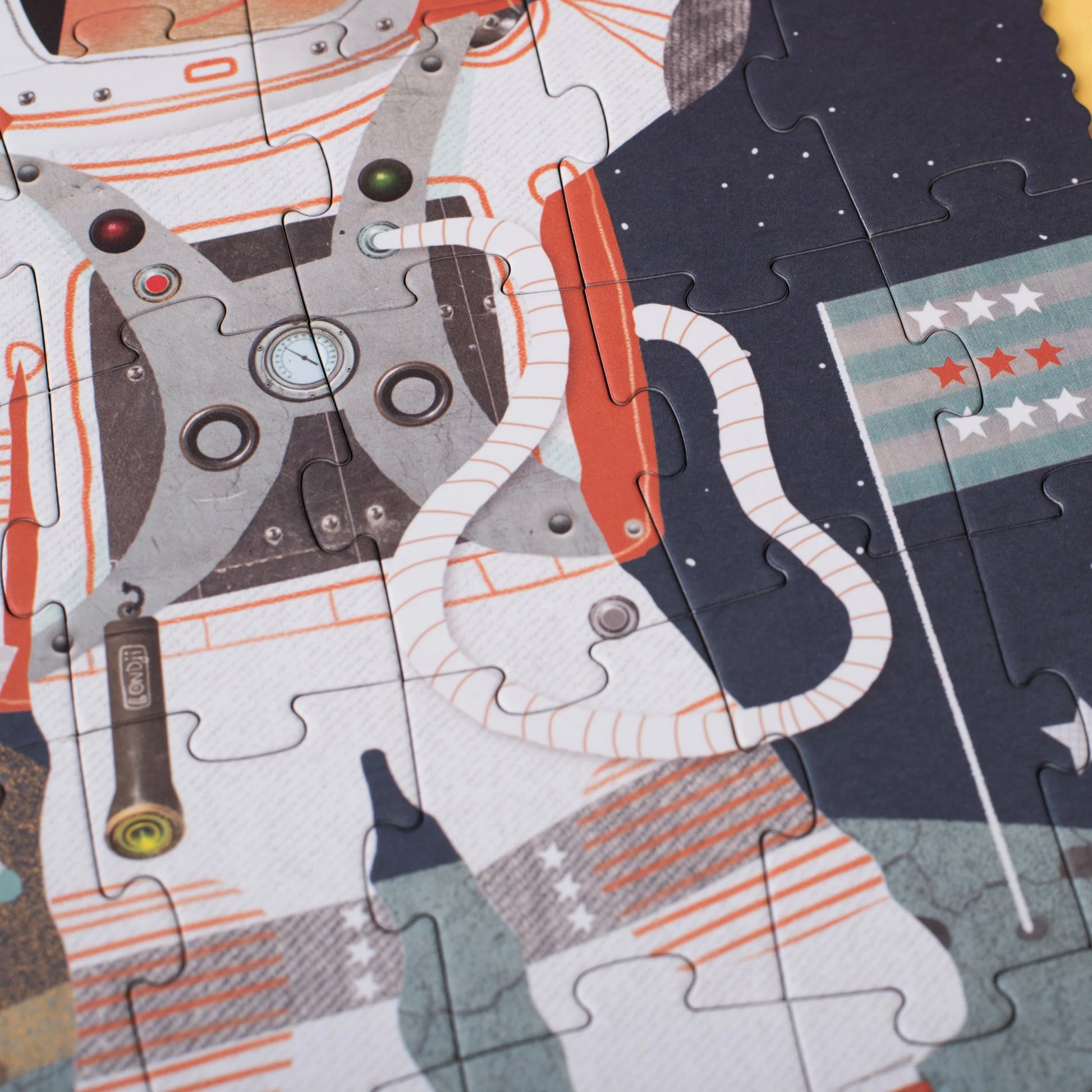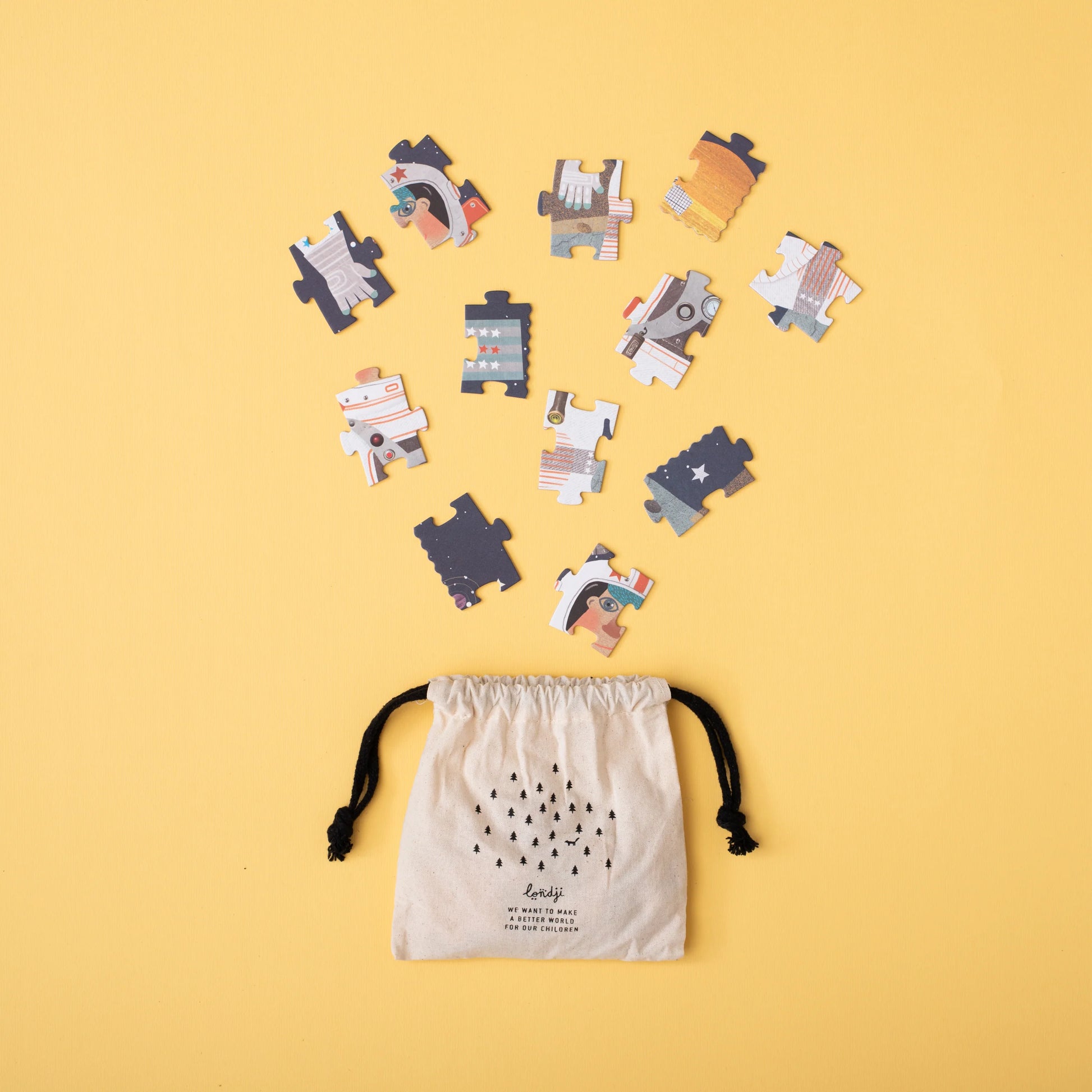 Major Tom has arrived at Londjis moon and is waiting to play with us! 36 piece puzzle made with recycled cardboard and FSC paper. Packaged in sturdy cardboard box. For ages 3-6.