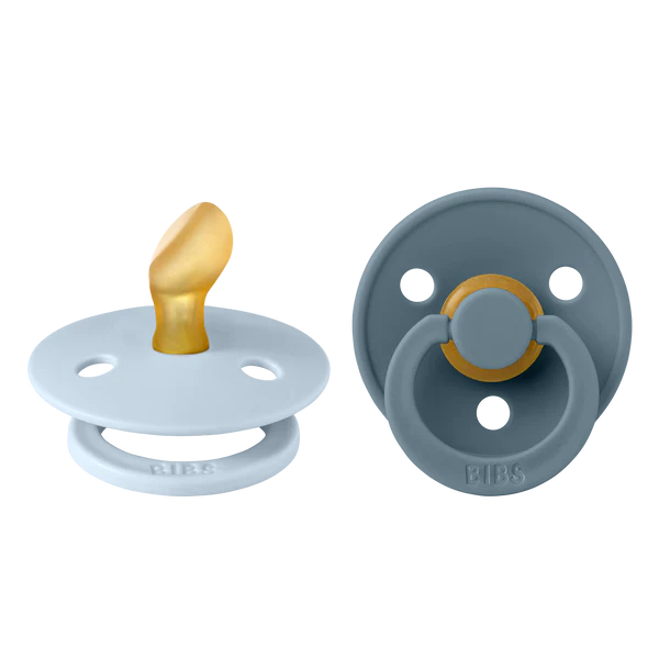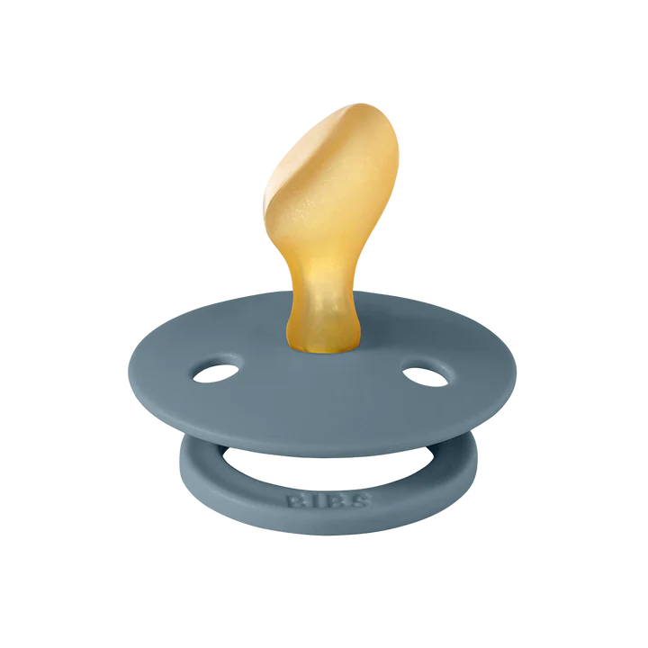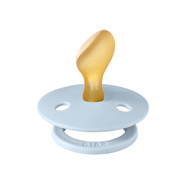 BIBS Colour is the original BIBS pacifier and has been on the market for over 40 years. It has the signature round BIBS shield with three vent holes and round BIBS engraved handle ring. The anatomically shaped nipple is curved at the top for a natural fit to the babyβs palate with an angled tip for easy tongue placement.