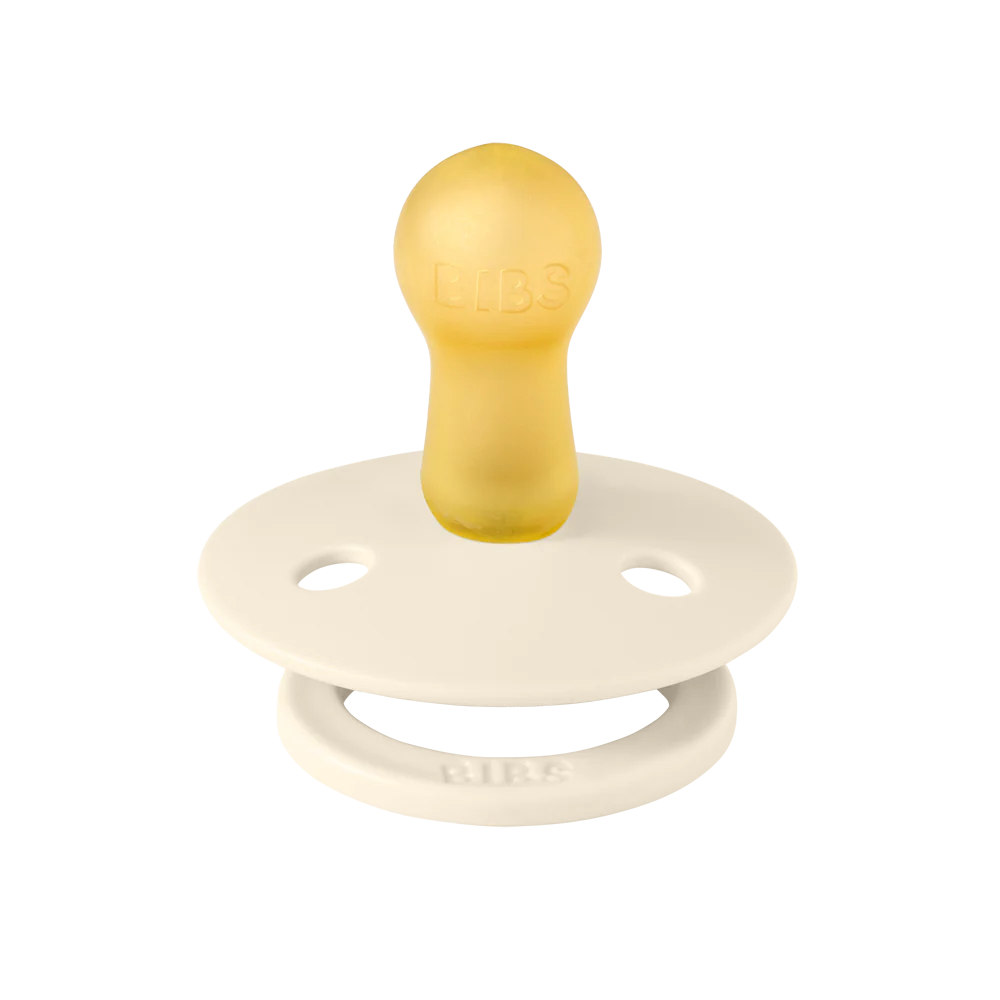 BIBS Colour is the original BIBS pacifier and has been on the market for over 40 years. It has the signature round BIBS shield with three vent holes and round BIBS engraved handle ring. The anatomically shaped nipple is curved at the top for a natural fit to the babyβs palate with an angled tip for easy tongue placement.