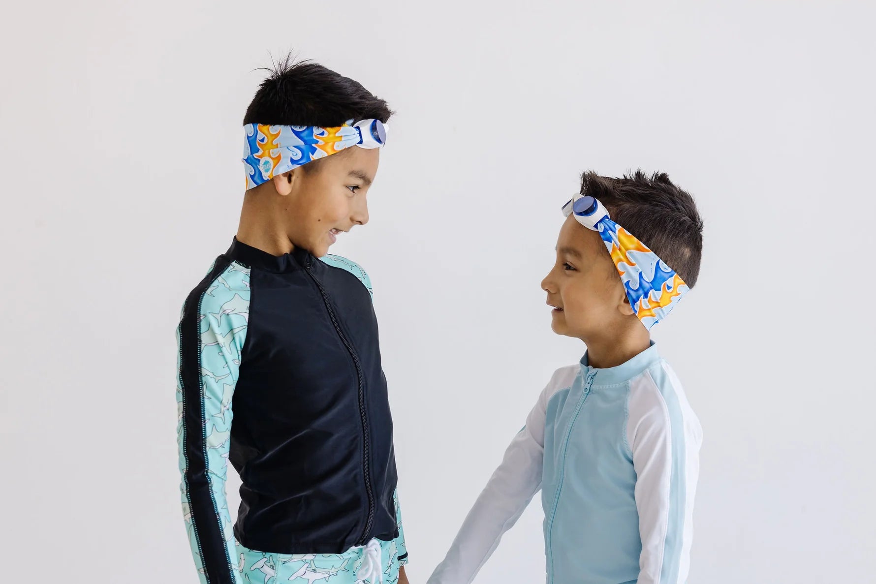 Our Sea Glass swim goggle features our tangle-free strap in a light blue and green print paired with white frames and lightly tinted blue lenses.