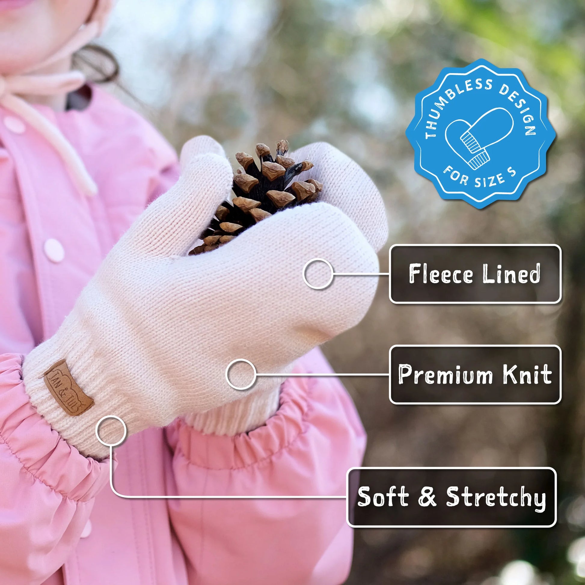 Thoughtfully designed to keep little hands snug, our Kids Cozy Knit Mittens have a soft fleece lining for added warmth. These classic mittens come in a thumbless style in size small so theyβre easy to get on your babyβs wriggly hands. Whether youβre skating or building snowmen, find the perfect chilly weather outfit! These cozy mitts come in a variety of soft colours to match our fall and winter gear.