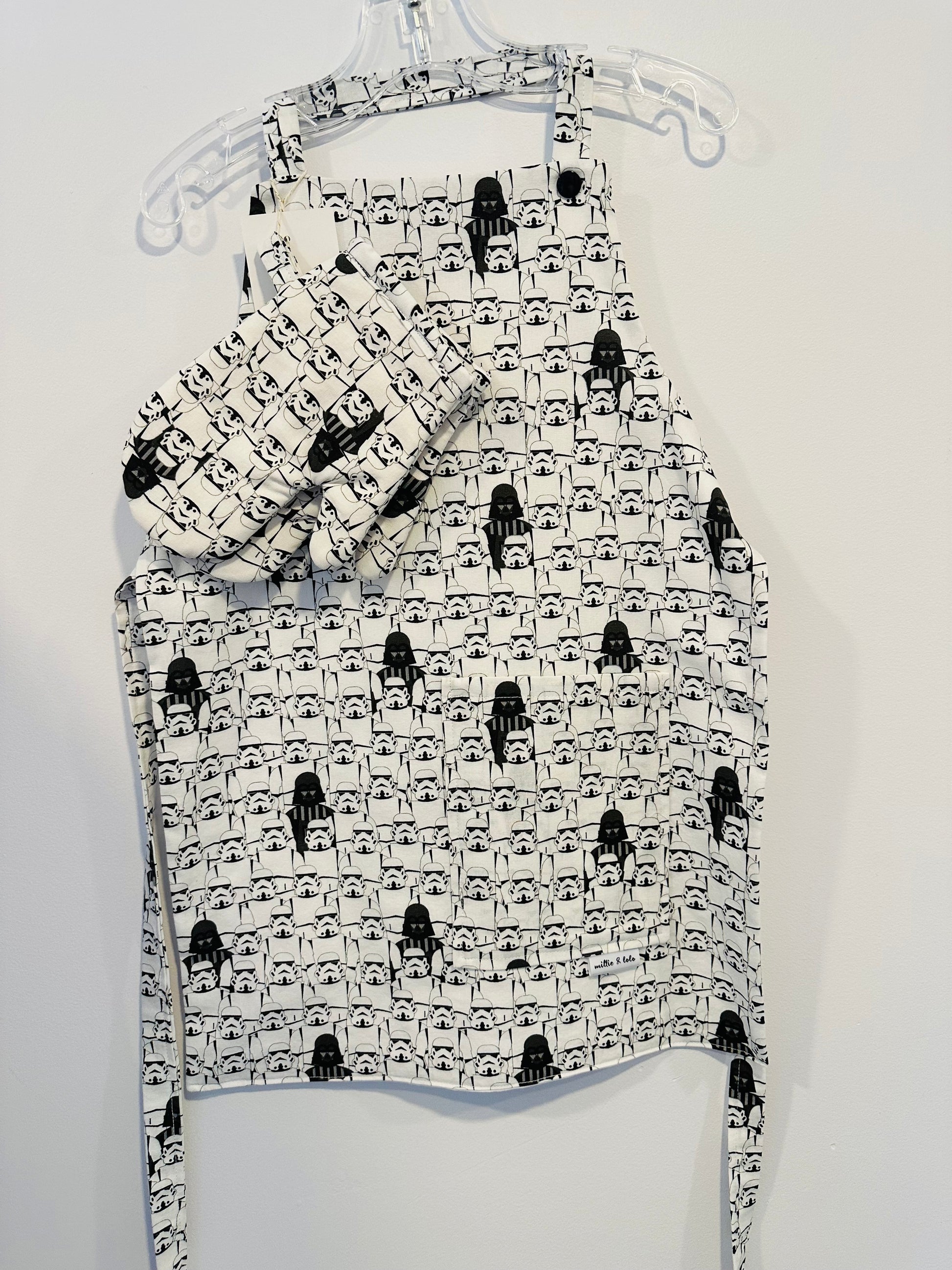 The apron features a front pocket to hold their kitchen tools and treasures, as well as an adjustable neckband so that it will grow with them.