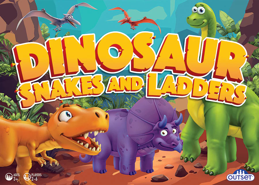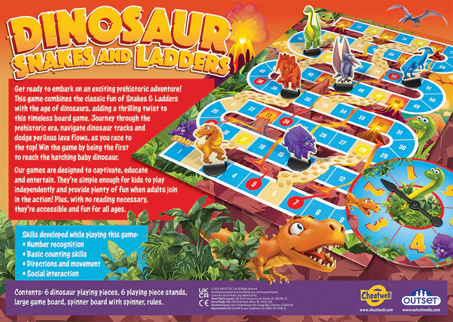Dinosaur Snakes and Ladders requires no reading in the game (once you understand the rules). Simple game play with kids spinning the spinner and counting the number of spaces to move forward to reach the egg hatchling at the top of the board. Cute dinosaur playing pieces are fun to play with as kids make their way up shortcuts by landing on dino tracks or get sent back a few spaces down the lava flow. Great social interaction game that even adults can enjoy!Â