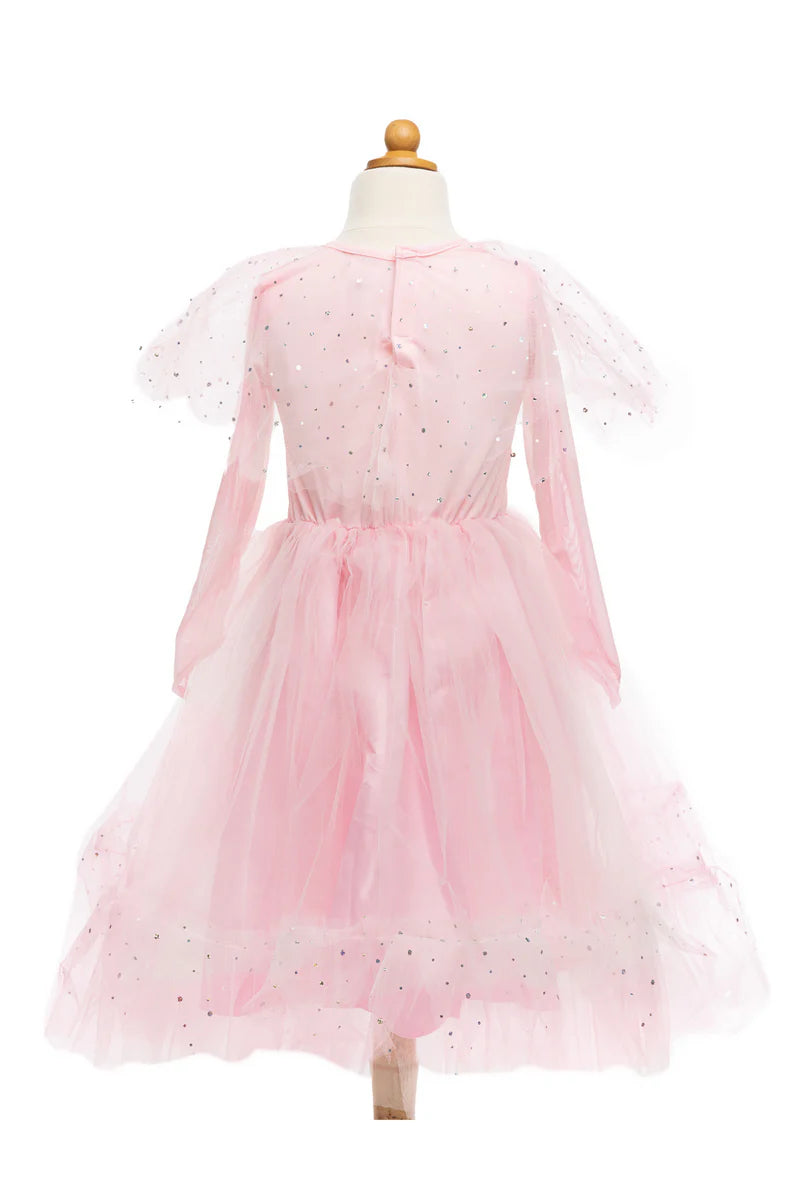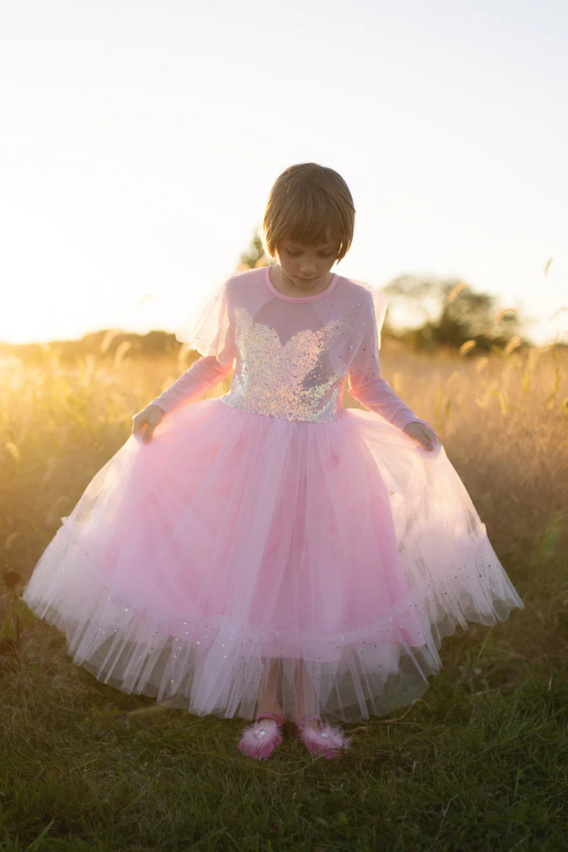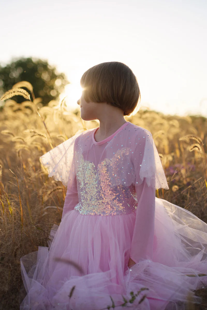 Elegant in Pink Princess Dress is a stunning design with a gorgeous sequinned bodice and illusion neckline (sweetheart neckline which is finished up to the neck with sheer and stretchy knit fabric) and satin trim. Attached to the neckline is a lovely sparkly capelet with scalloped finish, itβs made with pink mesh fabric showcasing printed holographic sequins. Elegant long sleeves are finished to a point. The skirt has a nice rich gathering of pink tulle finished with a ruffle made with the same holographic print as the capelet. The back of this dress has a Velcro closure and the elasticized waistband with a smocked waist (extra fabric gathering) provides even more comfort and size flexibility. Machine washable! This glamorous dress is sure to become your little oneβs favourite childhood play costume!