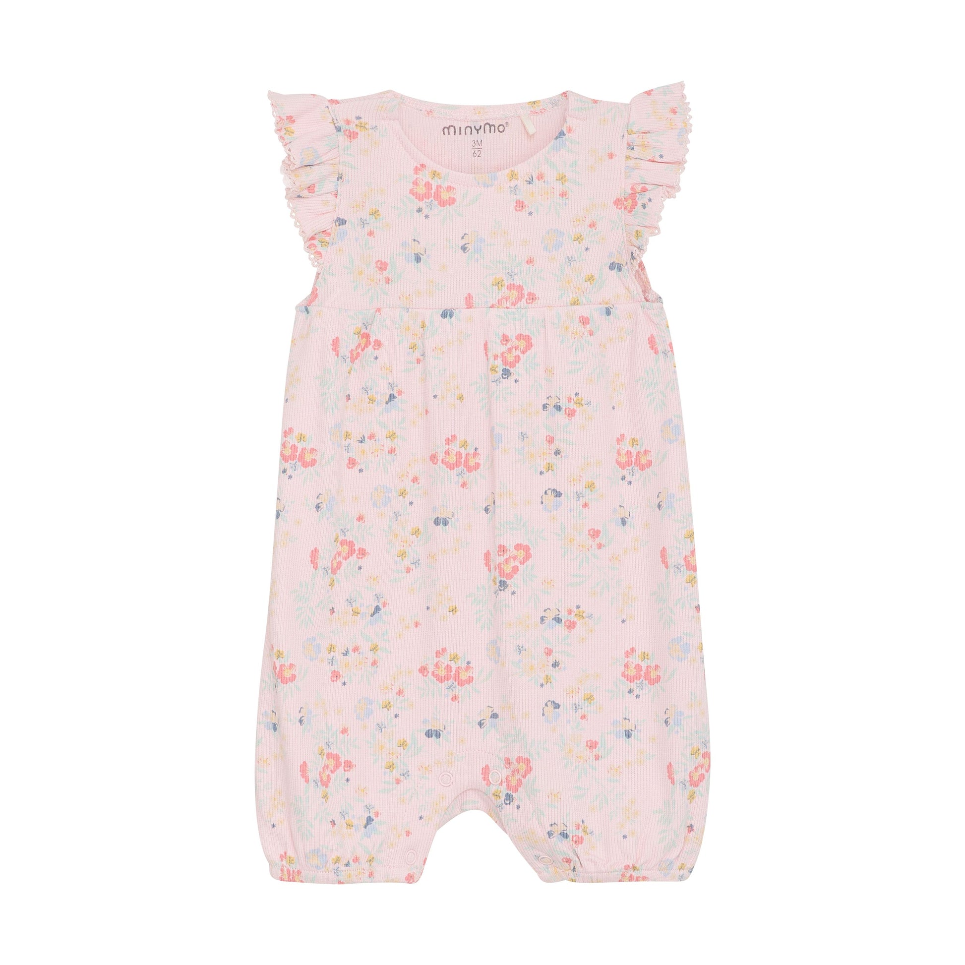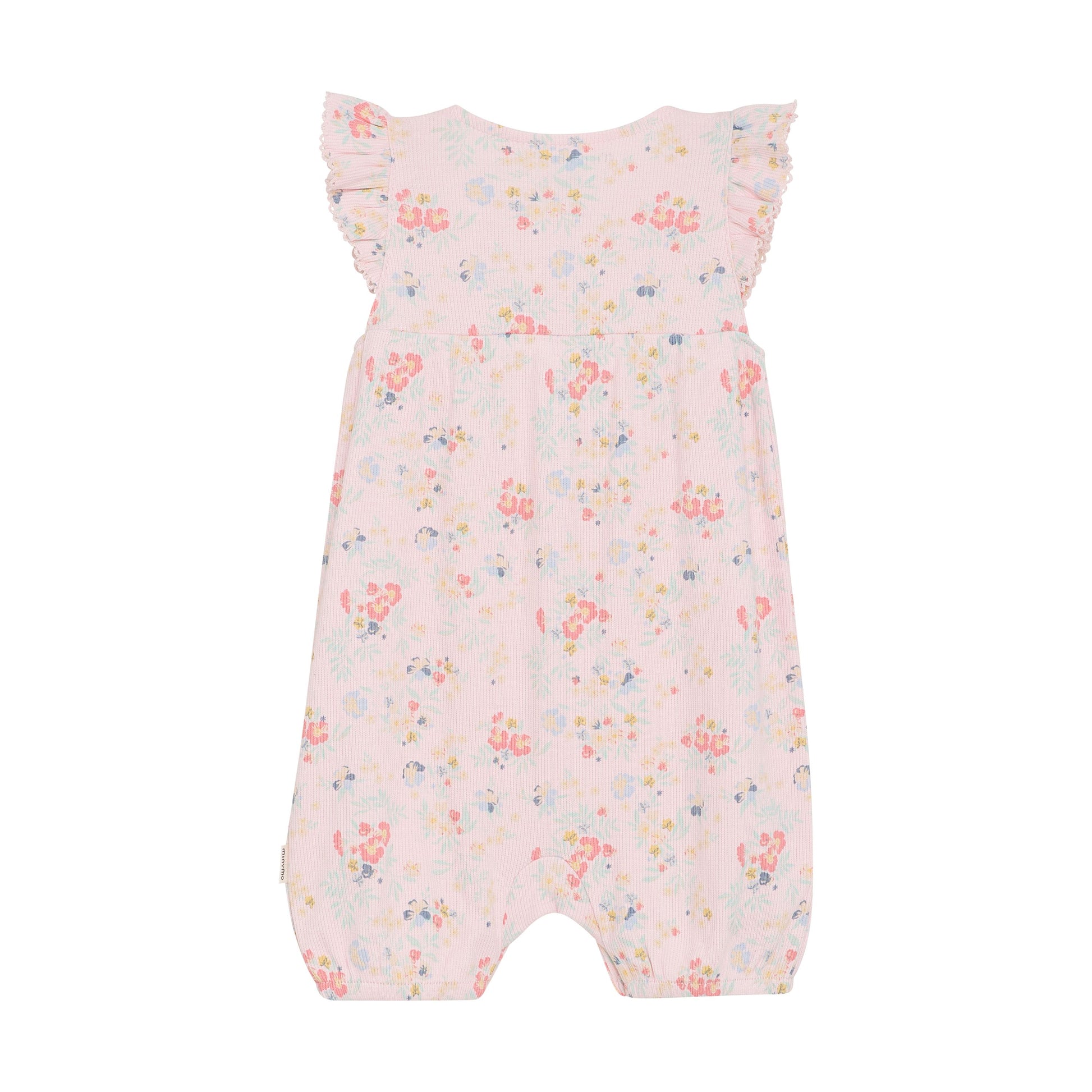 Fine short-sleeved suit with allover print. The suit is made of a comfortable viscose blend and has a nice floral print all over. Elastic in the leg openings ensures a good fit. Large ruffles at the shoulders and fine crochet detail at the neck. Closes with hidden snaps on the shoulder and snaps between the legs. Certified acc. to OEKO-TEX® STANDARD 100 Cert.