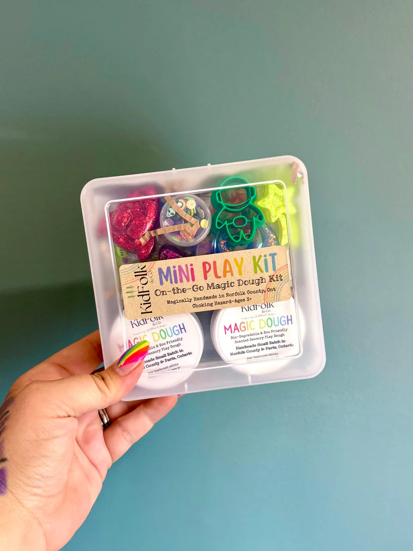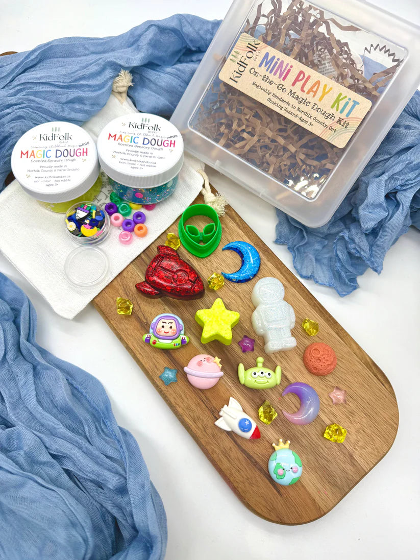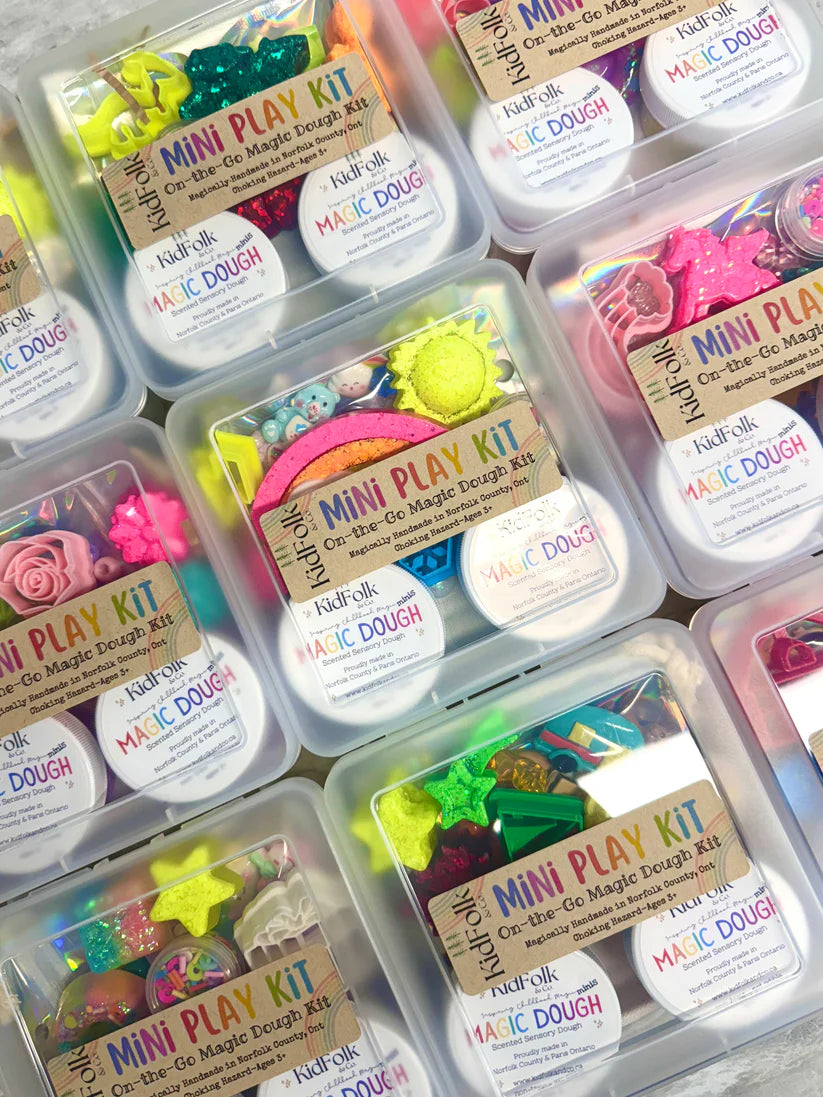 Let your child explore their senses with our small batch handmade Magic Dough! Each mini kit will come with two 2 oz Magic Doughs, a themed charm pack, our handmade resin toys, an eco-cutter, polymer clay sprinkles, acrylic gems and a canvas bag to hold all the small parts!
