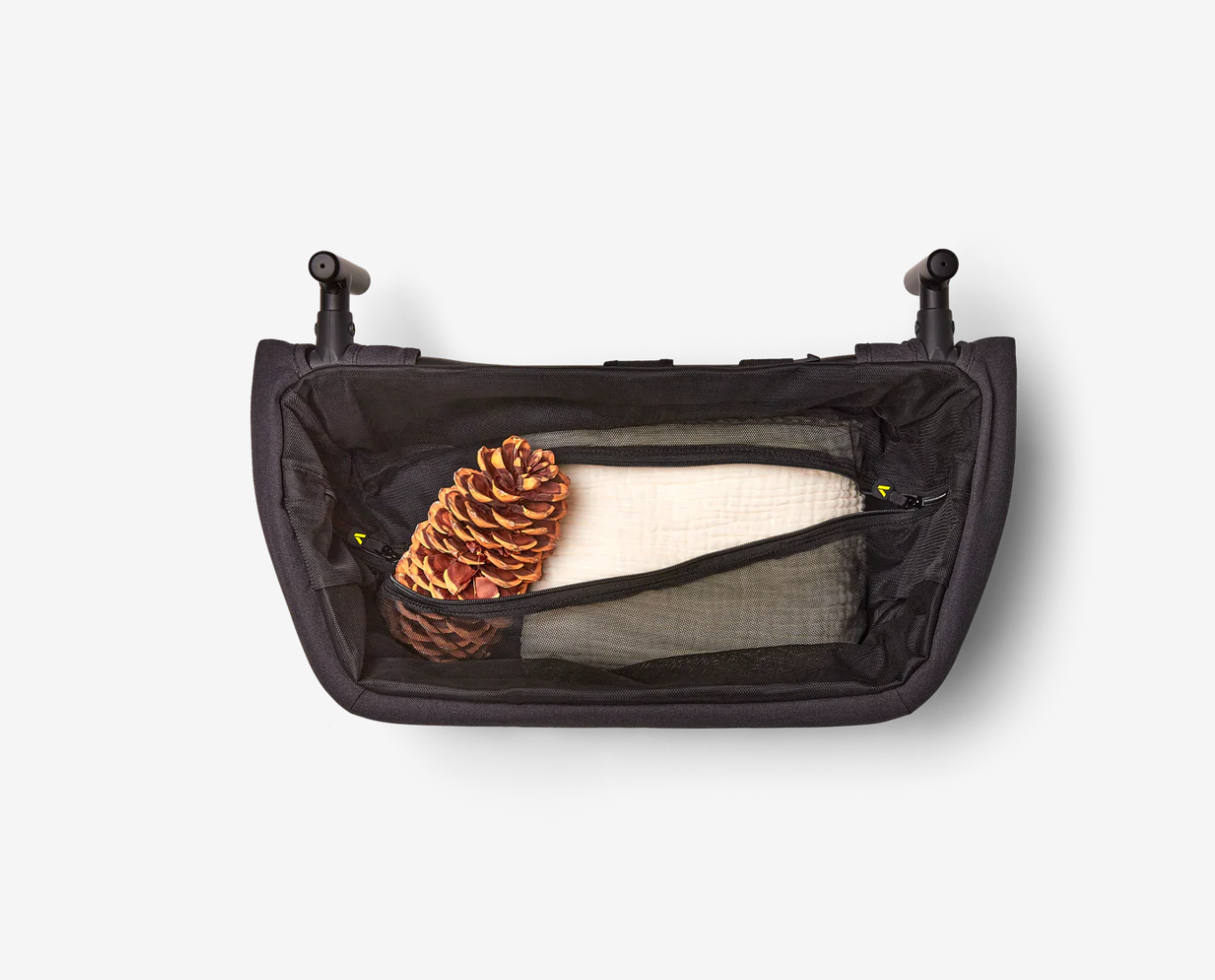 Snap on more cargo space to your Cruiser. Our lightweight aluminum and soft-sided storage basket mounts solidly into your Cruiser's two anchor points behind the rear seat. It folds for easy transport or storage without removal. The soft sided construction is removable and machine washable. A mesh zipper hood either discreetly rests on the bottom of the basket or doubles the capacity by covering clothes and other bulky items. Drink and Snack Tray and Napper both fit comfortably in this accessory.