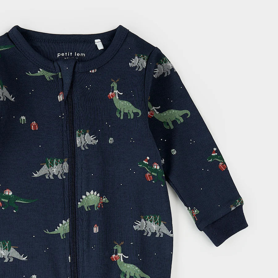 Christmas and dinosaurs? Name a better combination! This Holiday Dinosaur sleeper is perfect for your littlest dude and will keep him warm and comfortable during family festivities. With integrated feet, tiny toes are kept toasty while little hands are free to explore all the holiday fun. A two-way zip makes midnight changes quick and easy so everyone can get back to listening out for jingle bells and reindeer hooves on the roof.Β