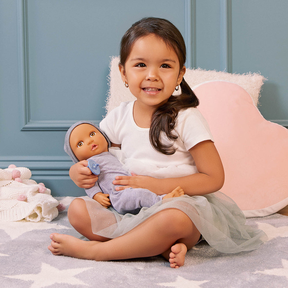 - 14” Baby Doll: This LullaBaby doll has a cute jumpsuit outfit with a matching hat, an extra-large pacifier, and a cuddly soft body made for little hugs.