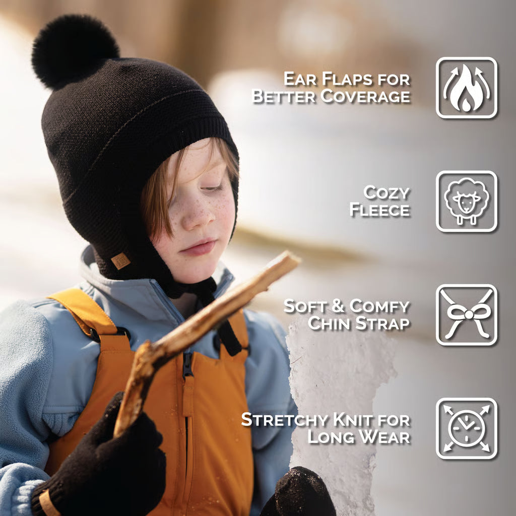 For trips to the Christmas market or playing in the snow, our Kids Pom-Pom Knit Hats keep little heads cozy! Fleece lined and made from a soft and smooth cotton acrylic blend knit. These winter hats are topped with an adorable pom-pom. Cozy earflaps provide extra protection with simple neck ties to stay in place during active play. Your little one will love to wear this classic cozy hat!