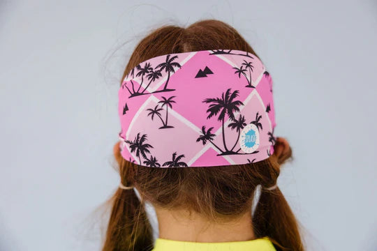 Our Malibu swim goggle features our tangle-free strap in a bright pink and white diamond print with black palm trees. Paired with a white frame and clear lenses.