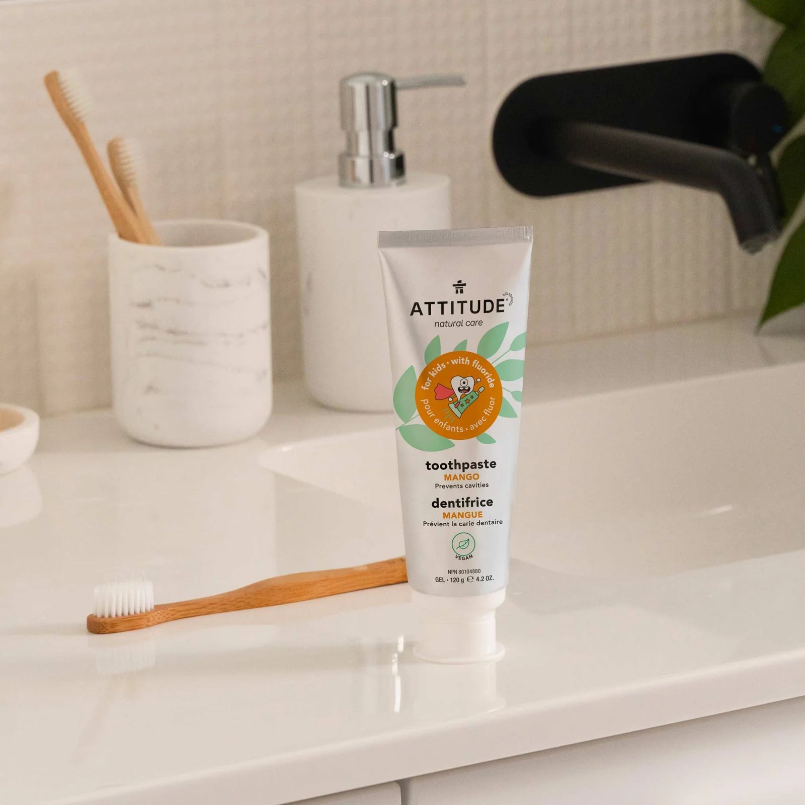 ATTITUDE Kids’ Toothpaste with Fluor is perfect for teaching your little ones healthy dental hygiene habits, thanks to its delicious, natural mango flavor. This paraben-free and alcohol-free vegan toothpaste is made with plant and mineral ingredients. Since its formula contains fluoride sodium, this toothpaste helps prevent cavities and also protects your child's teeth from acid erosion when used regularly. Our natural toothpaste helps rebuild fragile areas of the tooth and remineralize enamel.