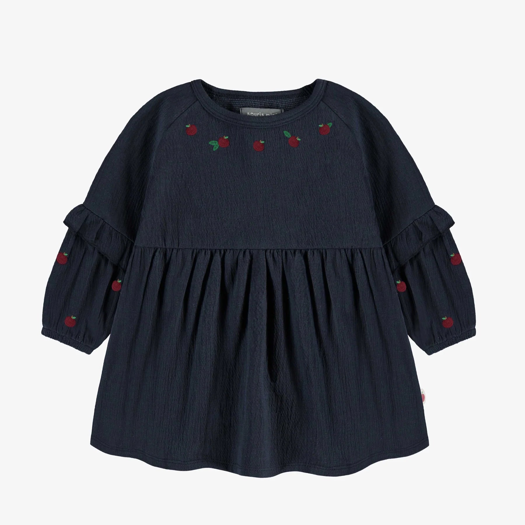 Baby Navy Dress with Apple Embroidery on Crinkle Jersey