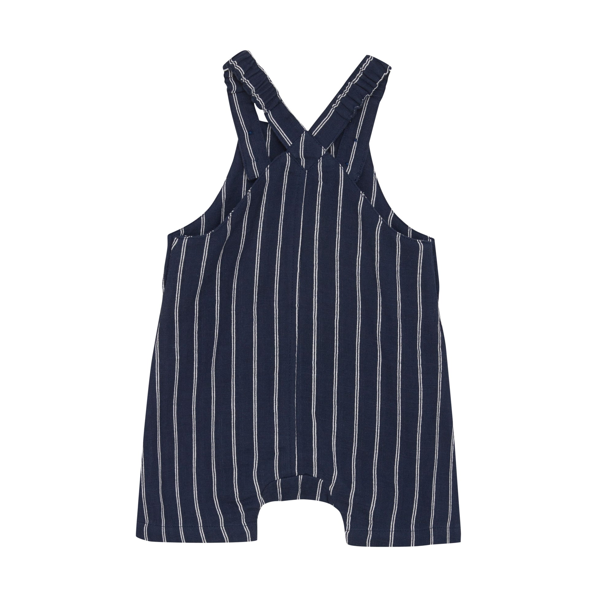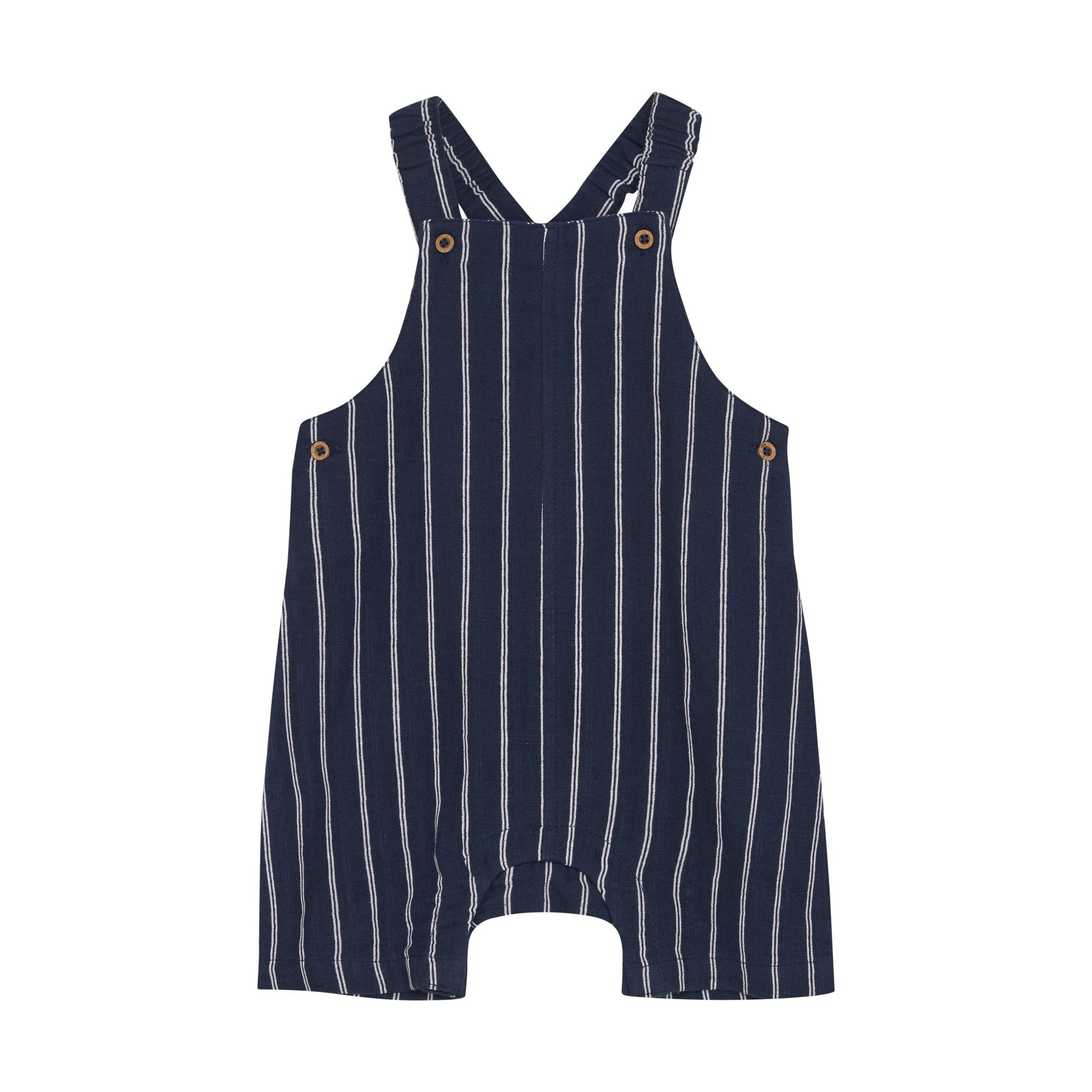 The suit is made of 100% cotton and has nice stripes all over. Closes with the buttons on the straps and the suit. There is elastic in the straps and on the side of the suit, which ensures a comfortable fit.