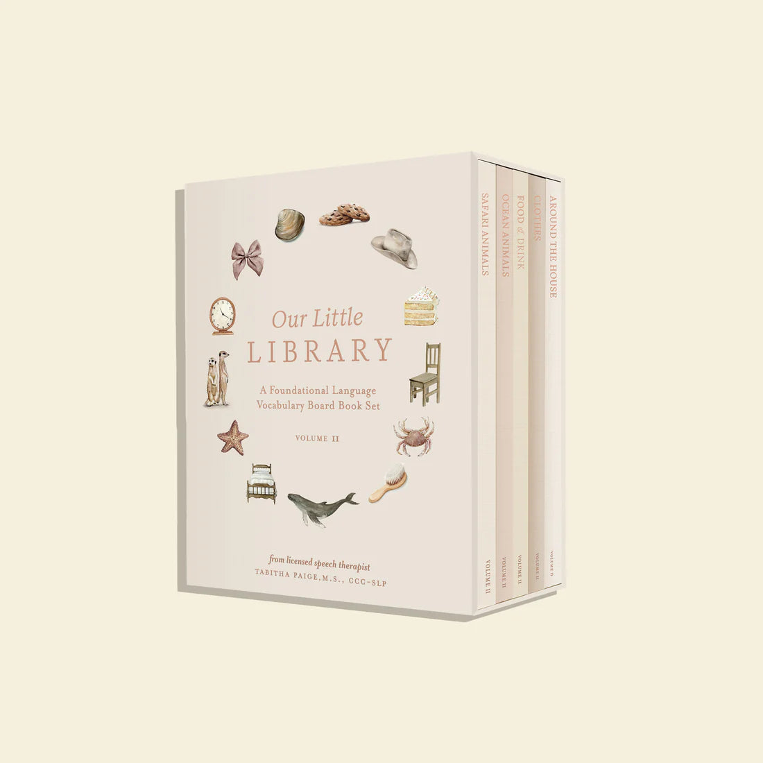Designed by a professional watercolor artist and licensed speech therapist, Our Little Library Vol. 2 includes five new board books that feature charming watercolor illustrations and foundational first words that will help you build your child's vocabulary. The durable materials and small book size also make them perfect for your baby's little hands.