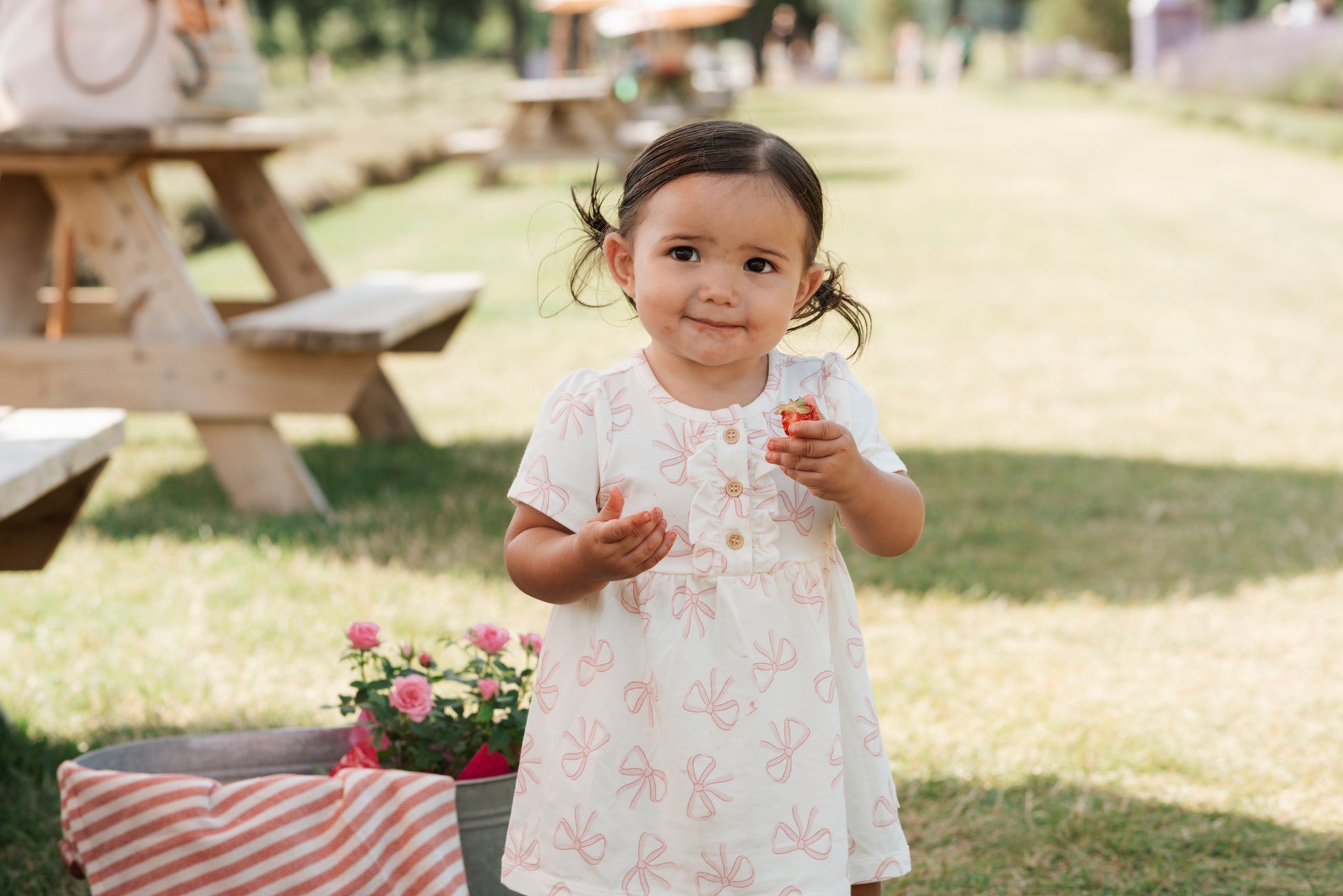 This delightfully soft bodysuit dress is made from a breathable combination of organically grown cotton and modal, with a little elastic for flexibility. With a flowy skirt that’s perfect for twirling, and frilly detailing along the button placket, the dress is designed for comfort and cuteness. Layer with tights and a cardigan for chilly days or let her roam free for those picture-perfect summer days.
