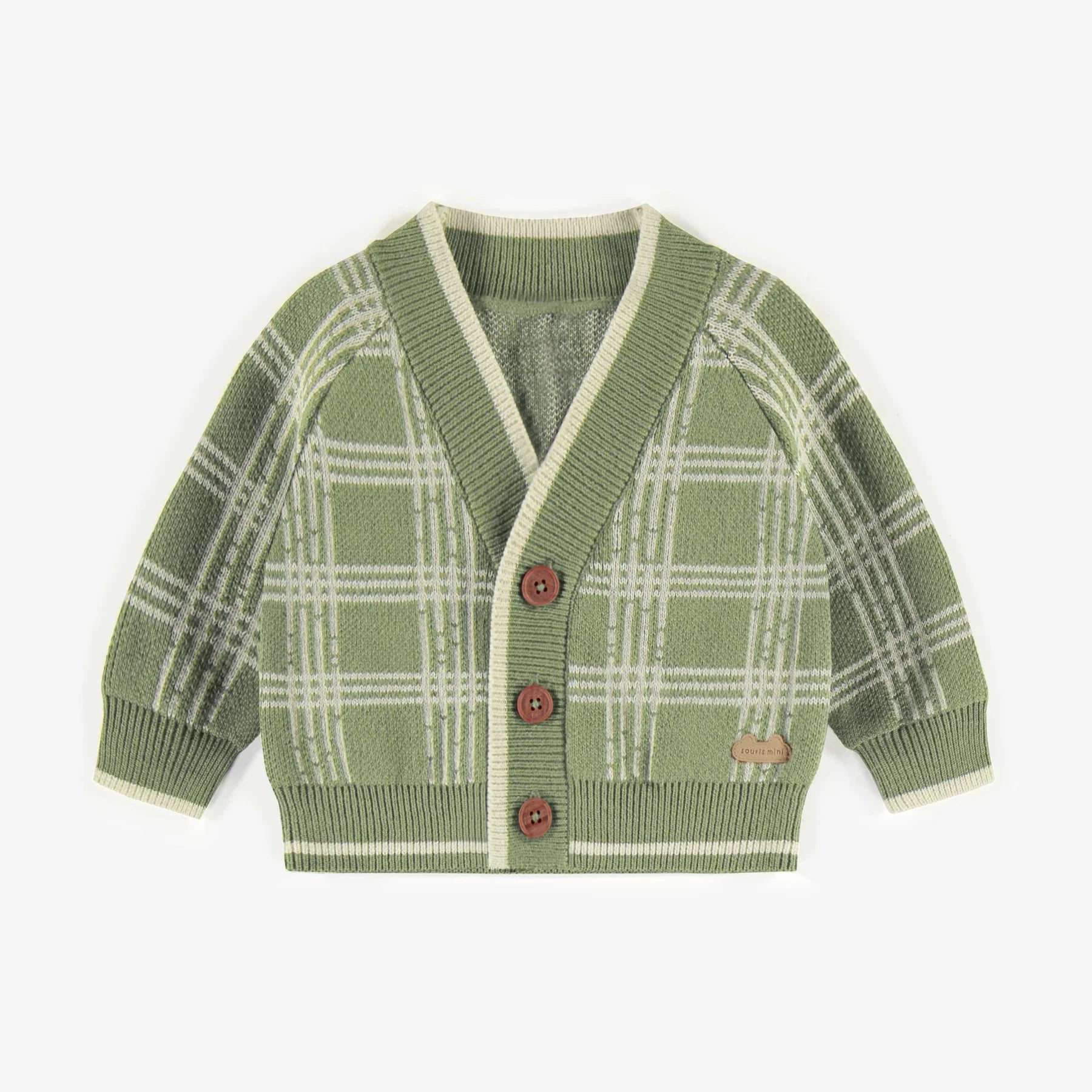 Green knit jacket with three buttons to attach it to the front and a ribbed collar that makes a “V” and raglan sleeves. Made in a high quality cotton cashmere imitation fabric.