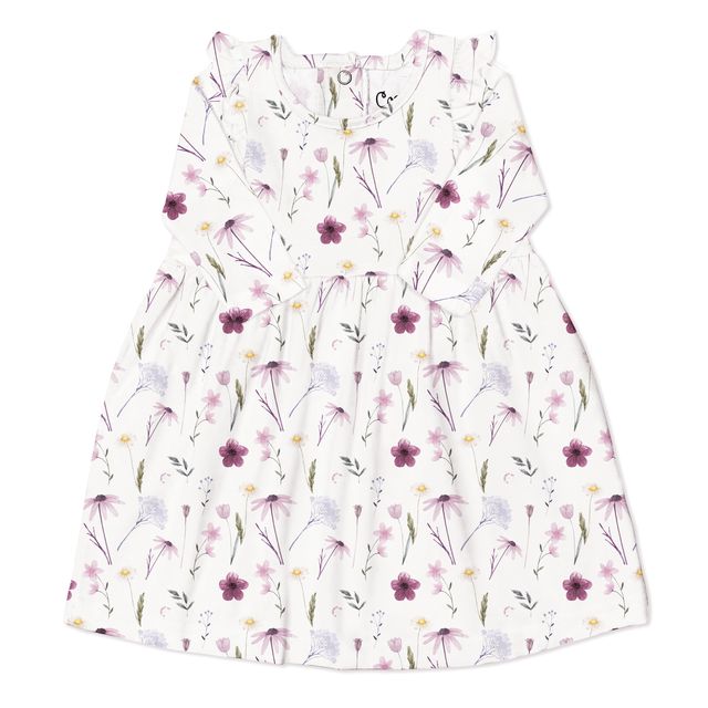 Sleeveless dress in an all-over print. The dress has details such as frills at the shoulders, and snaps at the back neck opening. The fabric is the softest TENCELβ’ modal which is not only lightweight, breathable and hypoallergenic, its production process is sustainable, helping to minimize environmental impact.