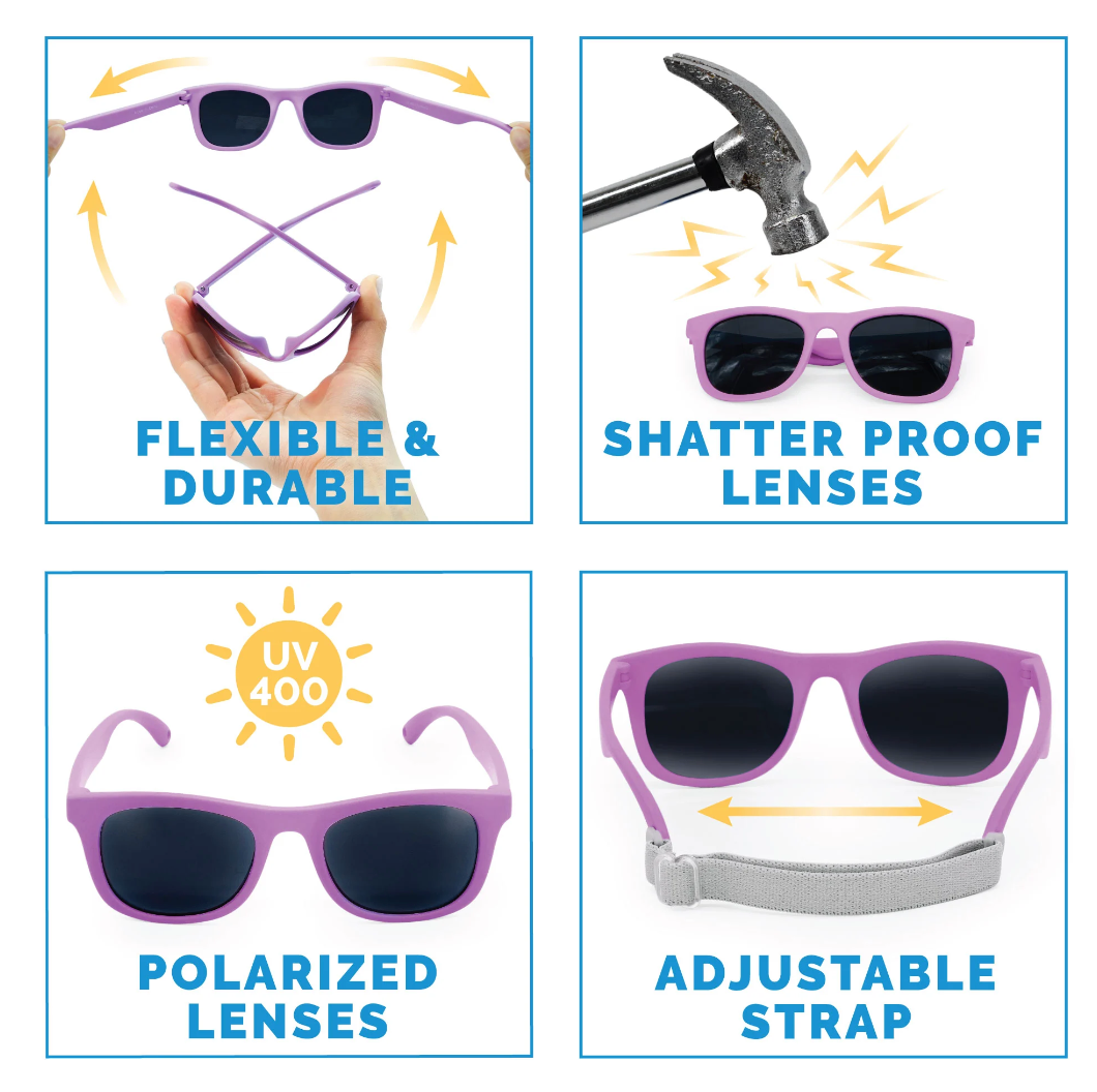 Each pair of sunnies comes with an optional strap β that means no more lost sunglasses! They stay secure on the most active kids at play, or when a cheeky baby pulls! The strap is soft, stretchy, non-irritating, and adjustable for years of use. Enjoy peace of mind knowing that your little oneβs eyes will be protected in style, all summer long.