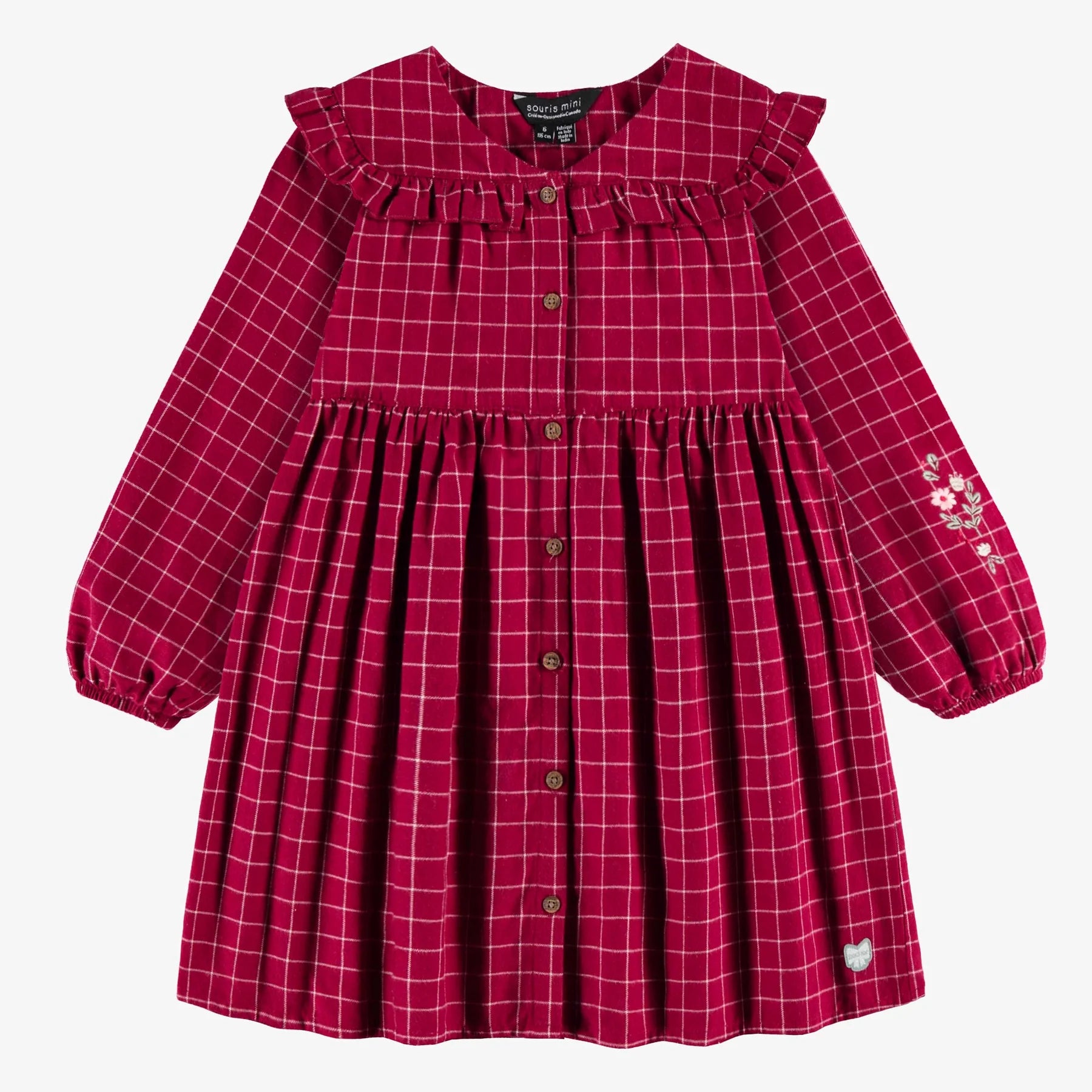 You will be charmed by the classic plaid pattern, its flared cut with details of flower embroidery on the front pockets. The ruffles on the shoulders and wrists add femininity and softness. Front opening with imitation wood buttons for easy dressing.