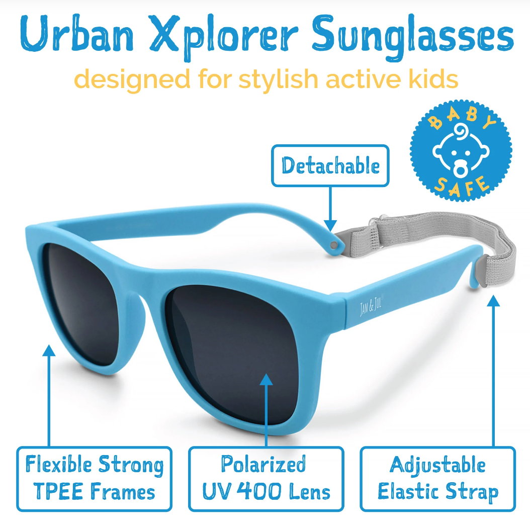 Jan & Jul Urban Xplorer Sunglasses are virtually unbreakable!Β Designed by moms with inquisitive children in mind, these sunglasses are built tough, designed to stay on, and super flexible so growing kids can wear them for longer! Your little fashionista will love picking out their favourite with a variety of fun colours and two lens styles to choose from: black and mirrored Aurora!