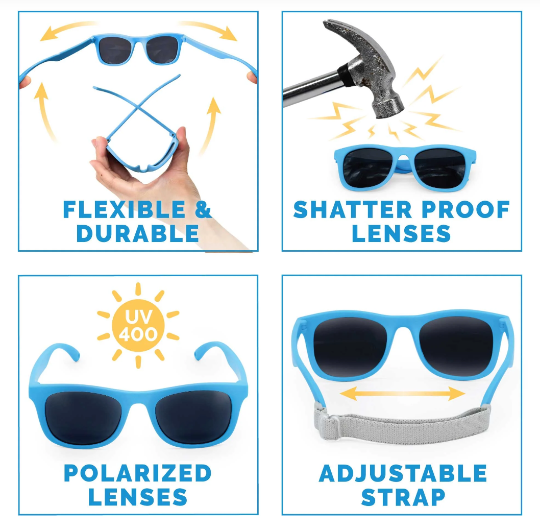 Each pair of sunnies comes with an optional strap β that means no more lost sunglasses! They stay secure on the most active kids at play, or when a cheeky baby pulls! The strap is soft, stretchy, non-irritating, and adjustable for years of use. Enjoy peace of mind knowing that your little oneβs eyes will be protected in style, all summer long.