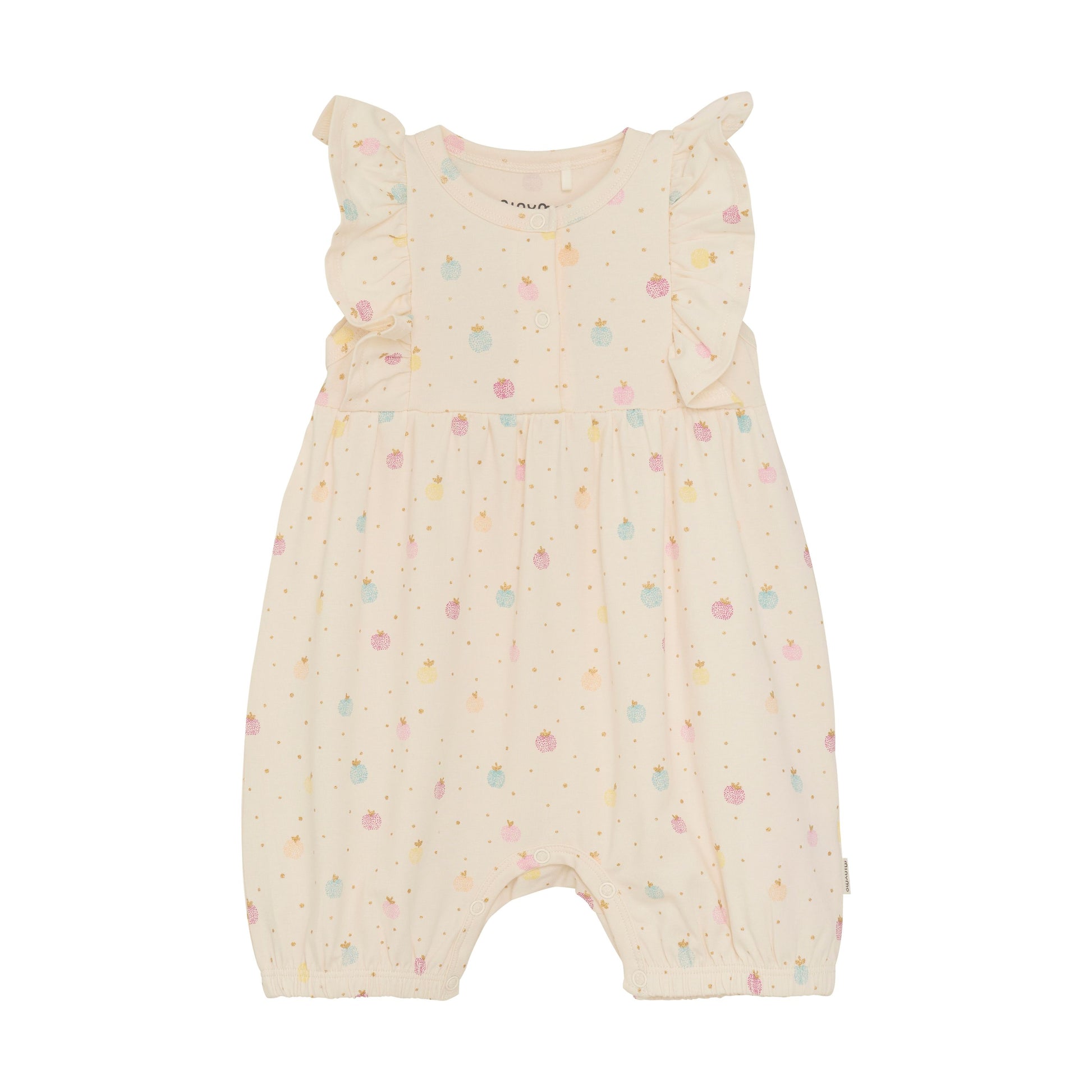 Fine short-sleeved suit with allover print from Minymo. The suit is made of a comfortable cotton blend and has a nice apple print all over. Large ruffles on the shoulders give a nice look. Closes with snaps at the front and snaps between the legs.