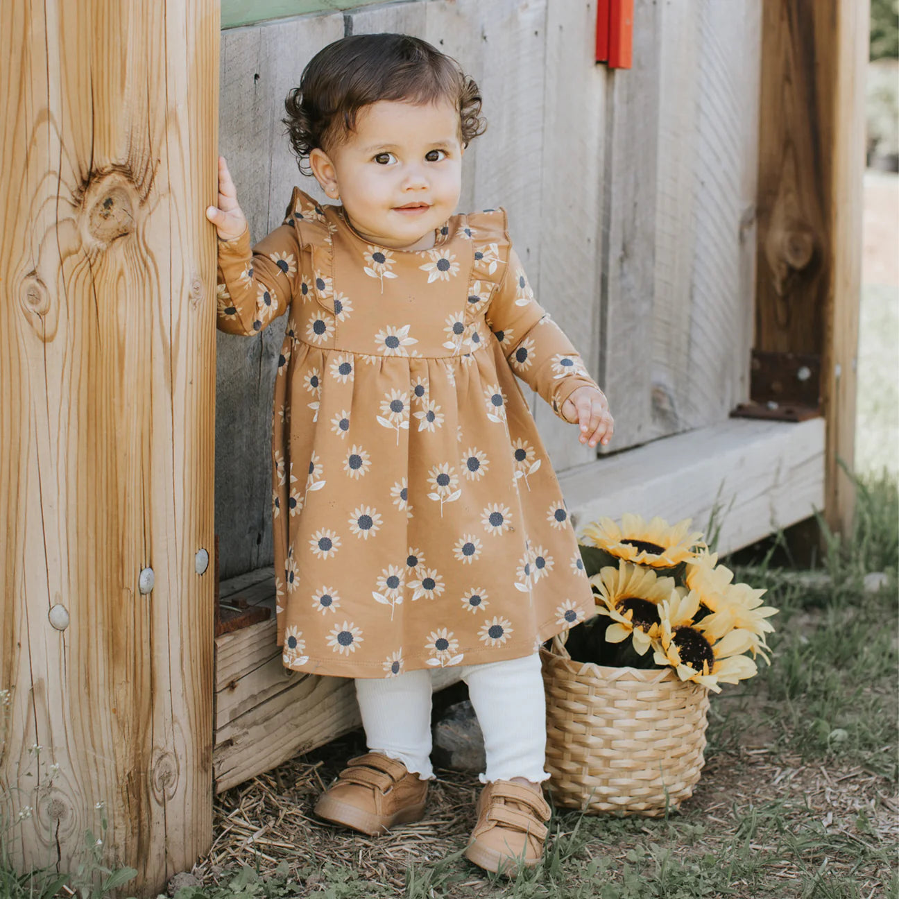 Perfect for adding sunshine to any grey day, this 2-piece dress set features our all-over sunflowers print. The dress has a smock style and ruffle detailing on the shoulders for a girly feel that you’ll both love. Buttons at the back widen the neckline to make over-the-head dressing easier. With chunky leggings to layer underneath, the set is the perfect choice for a wholesome day out with the family in the countryside. Â