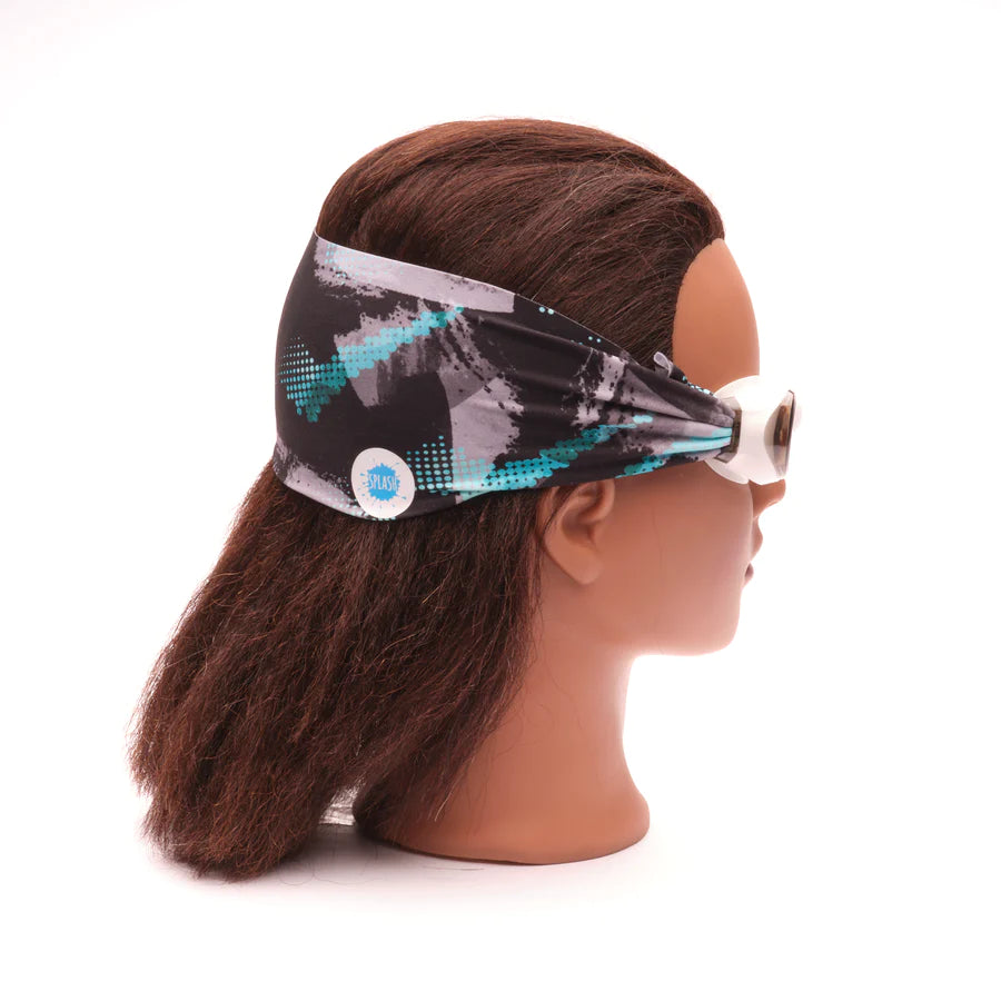 Our Surfer swim goggle features our tangle-free, patent-pending strap in a colorful dinosaur print with a light grey background, paired with a white frame and lightly tinted gray lenses.