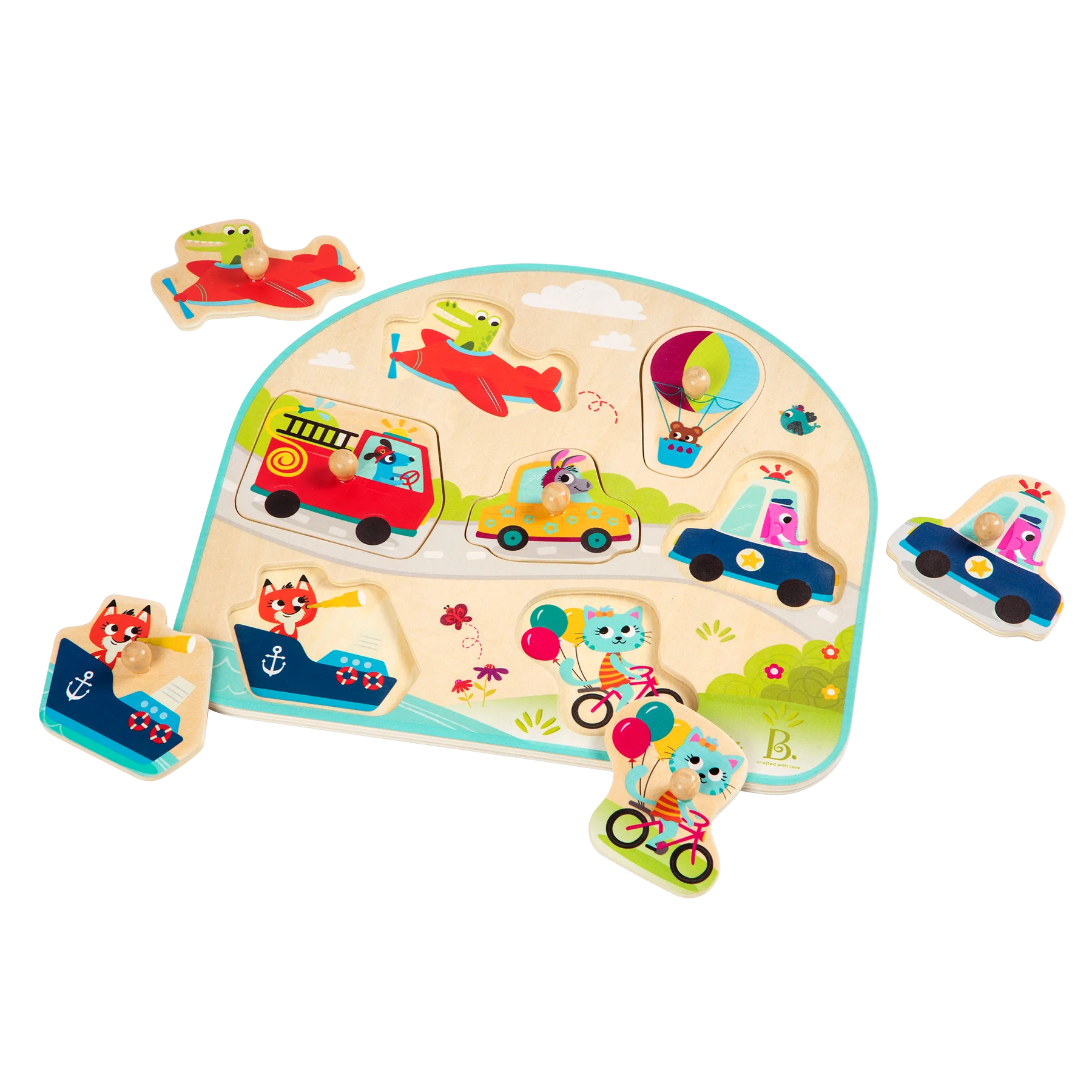 - Peg Puzzle: Learn about different vehicles, animals, and professions with a wooden peg puzzle!
