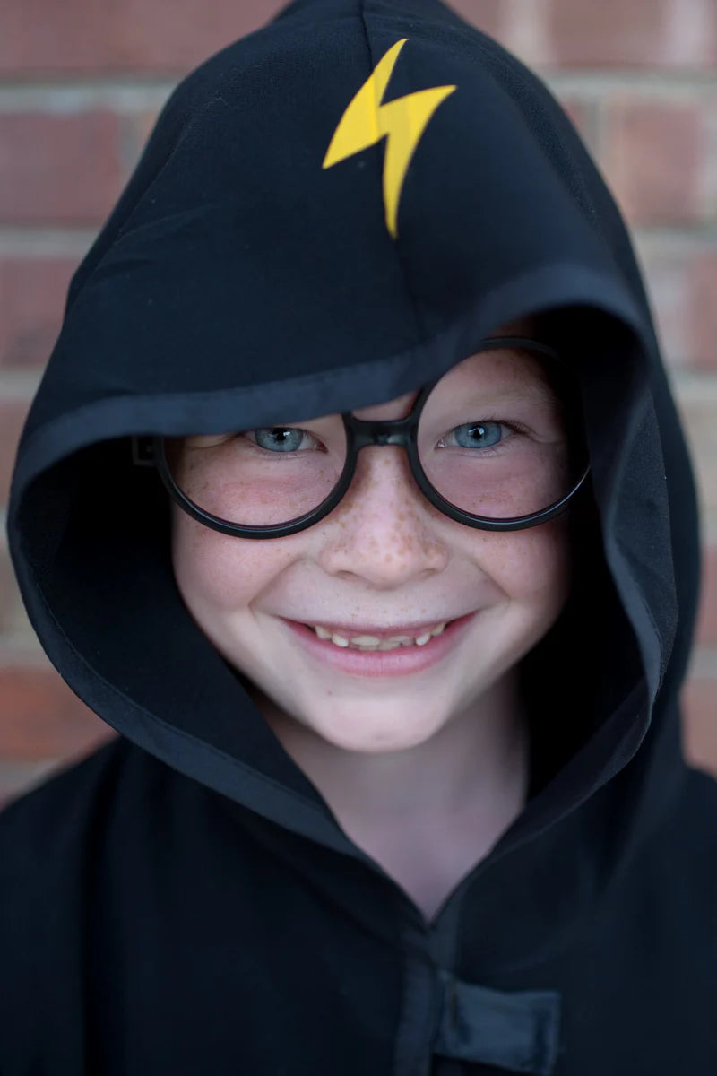Congratulations! You've been accepted to wizardry school! Don't forget to pack your Great Pretenders cloak. A high-quality design made with soft black fabric is draping comfortably on the body. This hooded black robe is adorned with a crest and a lightning bolt on the hood, and it comes with a set of faux glasses!